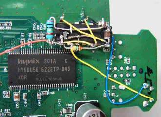 I soldered the passive components onto the pins of the NE556, which was a 14-pin DIP package. The package was then hot-glued onto the underside of the DNS-323 board near the power switch and the output of the timer circuit was wired across the front panel power switch. (With a DVM you'll see that one side of the power switch is grounded to the DNS-323 board's ground plane while the other floats to 5V when the switch is not pressed.)